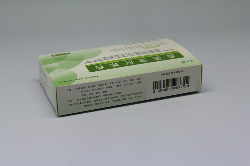 【功能主治】热解毒,调肝和脾。用于急性甲型、慢性乙型病毒性肝炎属"湿热蕴结,肝脾不和"证者,症见胁痛、脘痞、纳呆、乏力等。